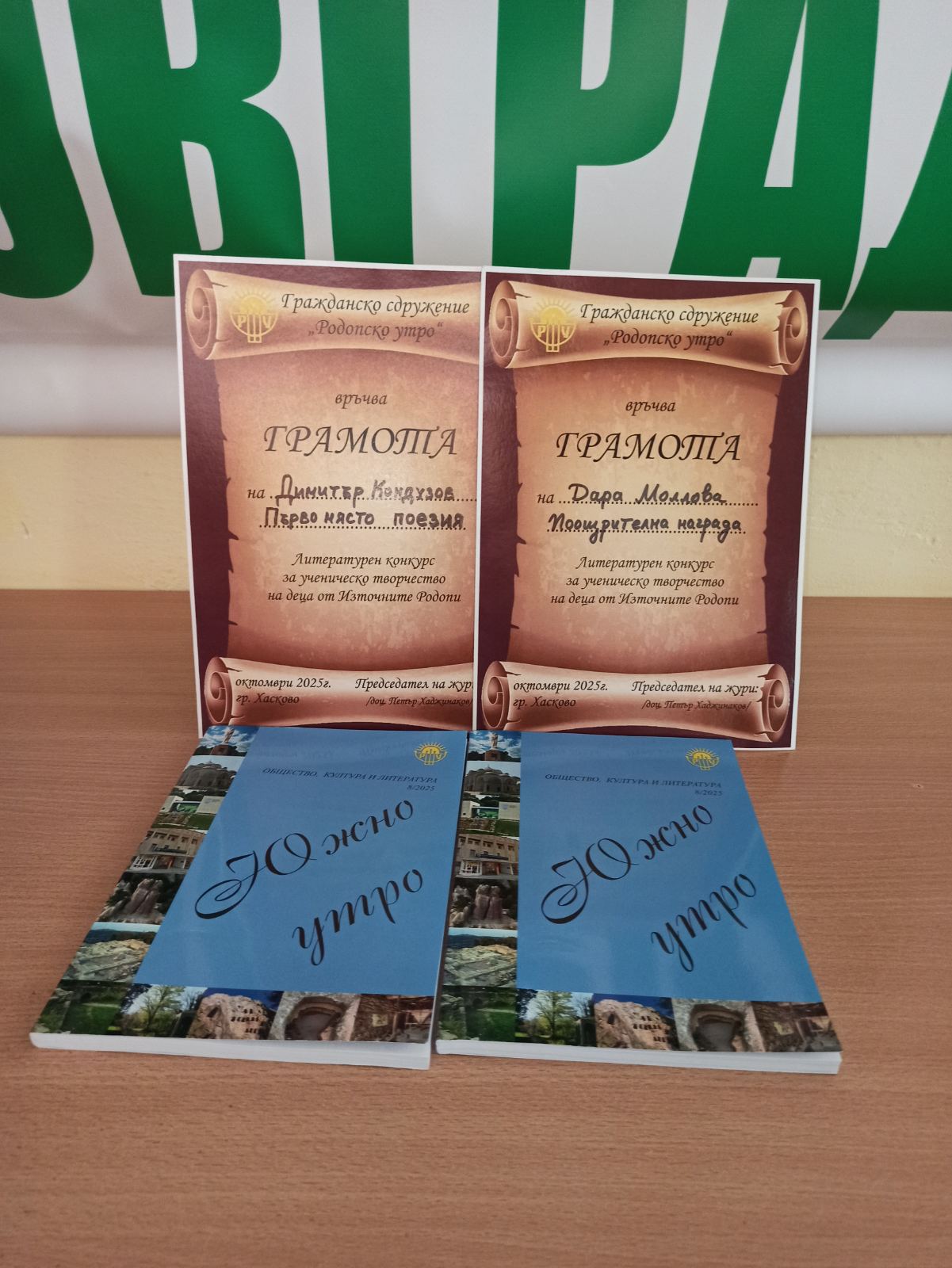 Талантливите Димитър Кондузов и Дара Моллова, възпитаници на СУ „Христо Ботев“, Ивайловград, бяха отличени в конкурса. Деветокласникът Димитър Кондузов спечели първо място в раздел „Поезия“, а Дара Моллова, ученичка от Xа клас, бе удостоена с поощрителна награда. Творбите на победителите са включени в бр. 8 на списанието за общество, култура и литература „Южно утро“. Техните произведения бяха оценени от авторитетно жури - творци и доказани професионалисти.