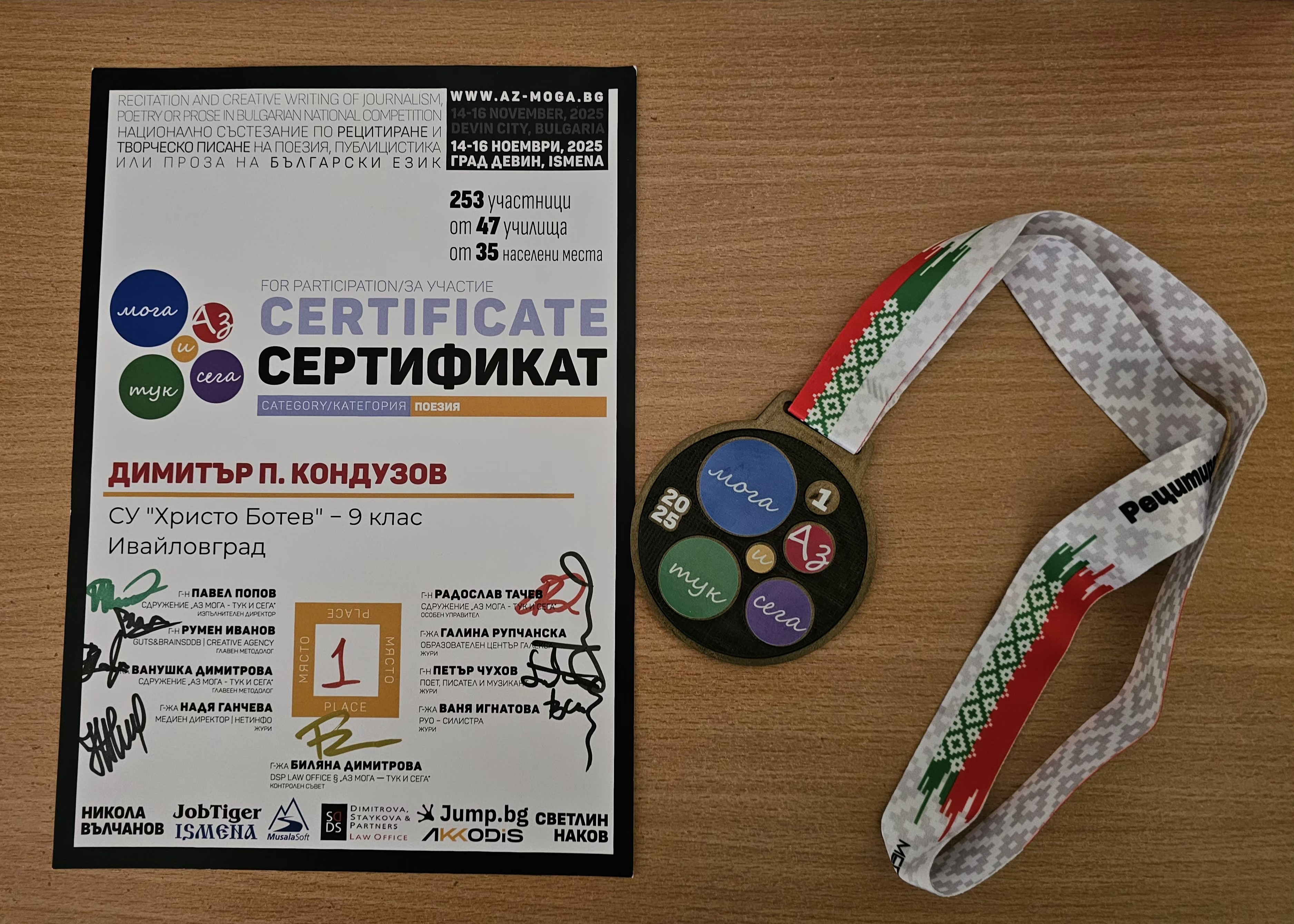 Димитър Кондузов, ученик от IX а клас в СУ „Христо Ботев“ – Ивайловград, за пореден път доказа своя талант и отдаденост към словото, като завоюва първо място в престижното национално състезание „Аз мога - тук и сега“ 2025 г. Надпреварата се проведе от 14 до 16 ноември в град Девин и събра 253 участници от 47 училища в 35 населени места.